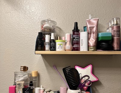 I have too much stuff. These shelves (I bought two) helped so much with clearing some bathroom counter space for me! My boyfriend and I installed both in about an hour— it’s easier to install them if you have two people, in my opinion. They hold a lot of my face and body products (see photo), and are very sturdy. We did use the anchors provided because the studs in my bathroom walls were too far apart to drill the shelves into. Highly recommend!!