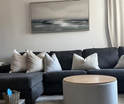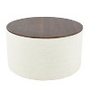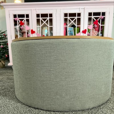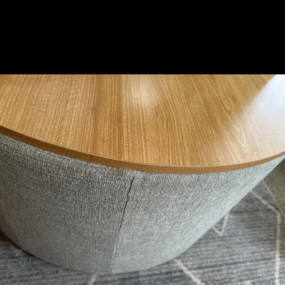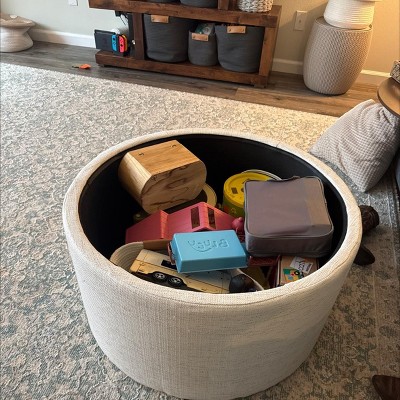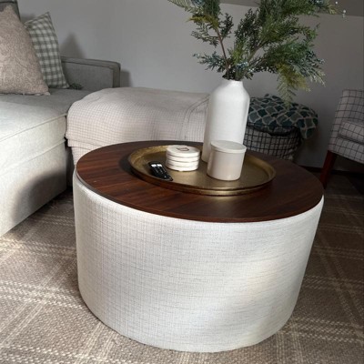Our Storage Ottoman with Wood Top in stain-resistant cream woen offers a sleek, modern design with functional storage. Use it in your living room or family room to contain controllers, remotes or toys or place it in your bedroom to store extra pillows or blankets. Two paired together doubles the impact wherever you need it most! Easy to assemble and maintain. Spot clean only. Please note that fabric and wood colors may appear slightly different due to variations in lighting or screen settings.