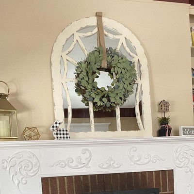 Add antiquated charm to your space with this large cathedral window mirror, featuring a distressed natural beige fir wood frame. The arched silhouette of this large wall mirror creates a cathedral window look with reflective mirror glass panels beautifully reflecting light. The distressing and neutral tone add both vintage and farmhouse style to this decorative mirror, while adding neutral versatile hues to complement any color palette or pattern. Easy and ready to vertically hang by hardware in back. Suitable for indoor use only. This item comes shipped in one carton.