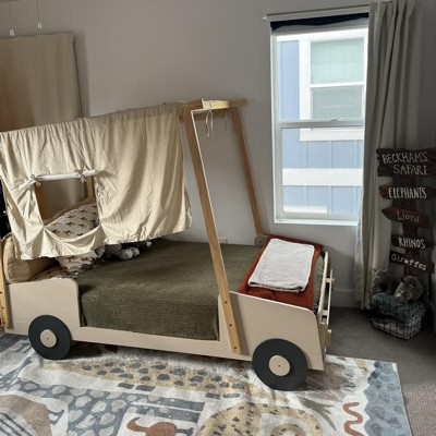 Wooden Car Bed with Pillows, Ceiling Cloth, Natural - ModernLuxe