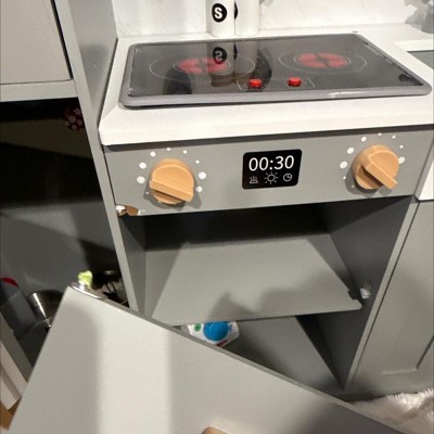 I really wanted to love it. But I have a bone to pick with this product. The product states it’s wood, but I think that’s a bit misleading. Feels more like plywood. Which is weaker material. I say this because when assembling it, a part broke and now seems complicated to fix. I thought it was such a cute play kitchen but that just ruined our gift. The oven door cannot be used. Also in the description states no batteries but it indeed needs AA and AAA batteries (which is fine) just thought to mentioned this.