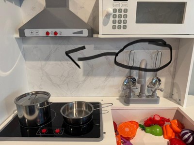 This kitchen play set would’ve received 5 stars but the two hooks that should be above the stove are above the sink. I tried emailing the company’s support email listed in the installation manual but received a failure delivery notification. Then reached out to Target customer service to see if they could help. All I needed was the correct “backsplash” with the holes over the stove but the manufacturer doesn’t have this as an option only returning the product back to the store or through mail for a refund. I only recommend this if you’re ok with the chance of the holes being in the wrong spot and not having a chance to receive a replacement part.