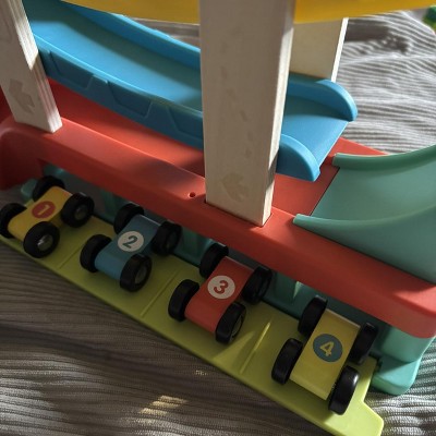This track has durable plastic ramps, and a great little gharage for the cars (hidden in bottom). Such a great toy for motor development, and fun!