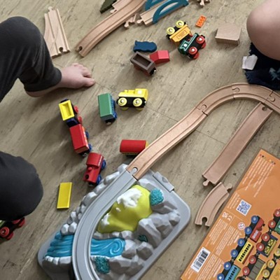 My 5 yr ild really loved this train. The colors were bright and the cars were different as one dumped sideways and he enjoyed that. . We did have a small piece break off of the train with two pegs to hold a car piece. Could become a choking hazard fir smaller children.