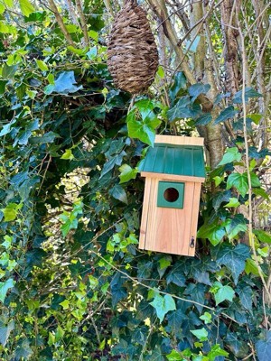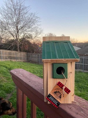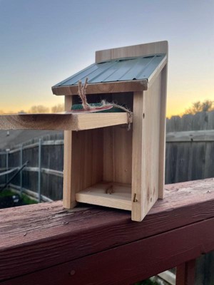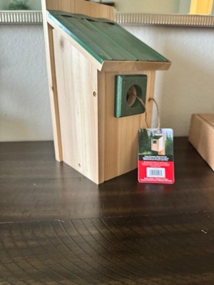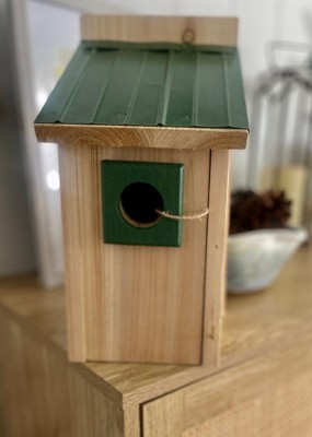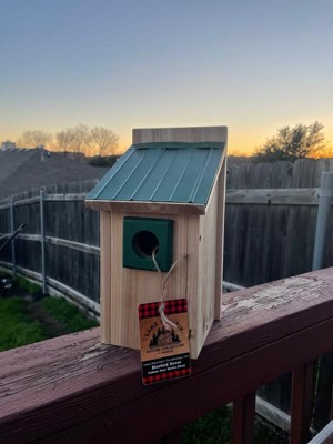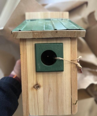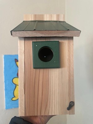 [This review was collected as part of a promotion.] I’ve been wanting a birdhouse for two years and somehow never made it happen, but boy this one’s perfect! I love the simple design of raw wood and green tin roof. I get quite a few blue birds in this area and am excited to have a little nook for them to perch in. My only reason for 4 and not 5 stars is the opening design of the birdhouse. I’d prefer something that opened down instead of up but also understand it may be better this way so the birds don’t accidentally weigh it open!