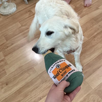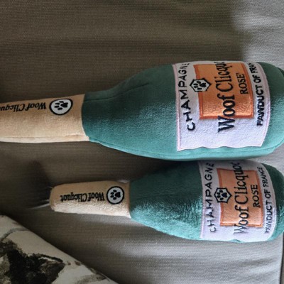 Uncork some fun for your debonair doggy! Our Woof Clicquot Rosé toy is just what your pampered pup needs for the pawfect afternoon playtime. The velvety, plush exterior not only looks and feels pawsitively fabulous, but also hides a fun squeaker inside that will drive your urbane best friend bonkers!