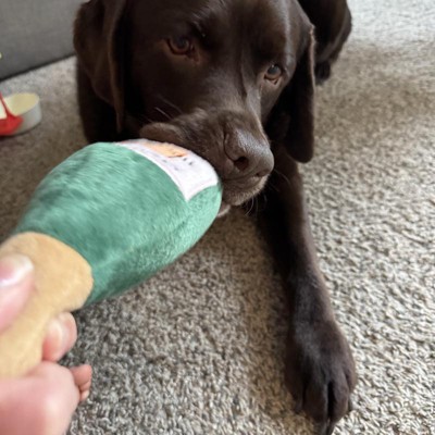 [This review was collected as part of a promotion.] My dog is a big fan of toys unfortunately this toy is not checking the boxes for him. This toy is so cute and I love the look and size of it. It also feels very durable. I do think the toy is lacking a squeaker, a crinkle component, or some other component to make it more than just a stuffed bottle. I think with one of these added components the dog toy would be more entertaining for dogs. I’m hopeful with time my dog will become more interested. I received an incentive to write this review.