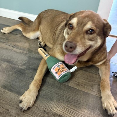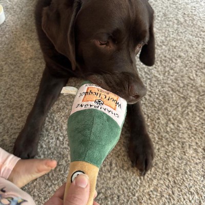 [This review was collected as part of a promotion.] I purchased this dog toy online. This xl plush champagne bottle is made for the dogs! It's double sided with one side looking like a bottle of high end champagne and the other side with the quote "Rose all day." It's squeaky and fun for dogs of all sizes. My dog is a pretty small dog and this toy is almost as big as he is, but he loves carrying it around by the neck of the "bottle." He has spent endless hours suckling and chewing on this toy and it brings him a lot of joy. For the price, it is a bit more than smaller dog toys or others on sale in stores, but can you really put a price on your pet's happiness? I received an incentive to write this review.