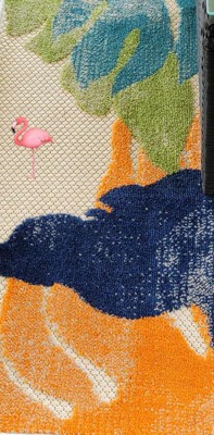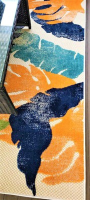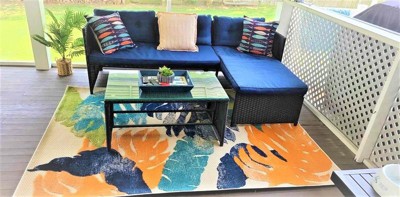 [This review was collected as part of a promotion.] I can't say enough about this bright, tropical outdoor rug. Matches my decor perfectly! Has soft patches of carpet, perfect for my pups to relax on & soft on my feet. Colorful, light & airy. Seems simple to clean, a little soap and water would do it. Makes me feel like I am on vacay! Very pleased!!!!