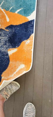 [This review was collected as part of a promotion.] The bright orange, blue and greens in this rug make our backyard entertaining area brighter and welcoming. Having a similar rug already, this was able to be added to the existing one to make the space more full coverage. The quality is great, since it is exposed to the rain and other outdoor elements it has not lost its colors yet.
