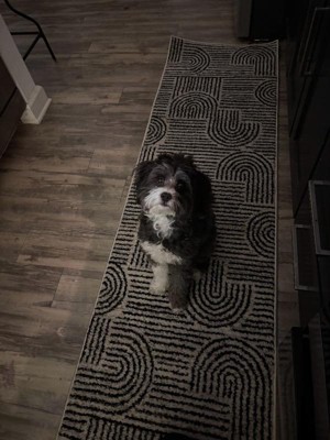 [This review was collected as part of a promotion.] This is a really nice runner rug. The colors are more cream and black in person (which I liked) vs. the stark white/black in the product picture. It is thick and comfortable and feels good to walk on. My dog approves as well and has a comfy place to lay in the kitchen where I have the rug. It says to spot clean so it should be easy to keep clean. Love the pattern. I think it’s much prettier in person compared to the product picture!