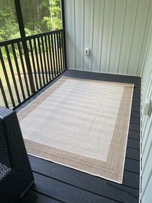 [This review was collected as part of a promotion.] I have been looking for an outdoor rug for this narrow covered porch and this rug is perfect. The best part, it’s truly reversible. Normally there is a tag preventing you from using one side, but not this rug. The tag easily clips off so you can use either side. I don’t know that I would use this indoors because the texture is rough, but it’s great for outdoor use. The one side was rolled pretty tightly but after only an hour unrolled, it was already settling. I don’t have any concerns that the creased side will remain creased. It came packaged well, double plastic wrap to ensure there was no damage. I went with the more beige side, but honestly, it’s neutral enough that either side would have worked. I think the quality of this rug will hold up for quite some time. I’m very much pleased and would recommend to anyone looking for an outdoor rug!