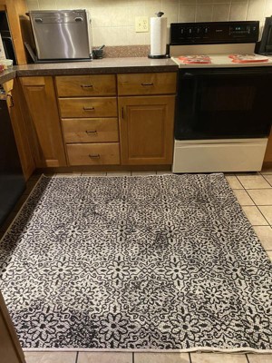 [This review was collected as part of a promotion.] I use this rug in my kitchen since I have a gallery style layout. It fits perfectly , it’s not too wide or too thin. The type of rug is great for a kitchen because i can easily sweep crumbs off and it withstands spills (since it can be outdoors) better than other traditional rugs .its slightly textured so it’s not too soft, which is great for a kitchen. The design pattern is exactly as pictured. My only two complaints are it does not have washing instructions, like for how to clean the rug indoors. I never believed In hosing my rug and letting it air dry outside so I wonder if I can put it in the washing machine. Also, it slides on my kitchen floor. Maybe concrete would have more grip but against kitchen tile, I have to use thick double sided tape to hold it in place .