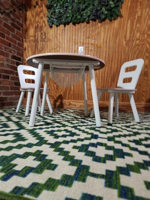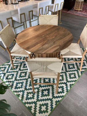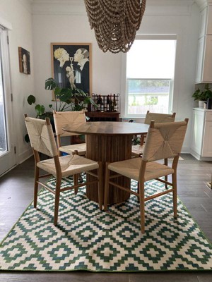[This review was collected as part of a promotion.] This indoor/outdoor rug is just gorgeous. Its simple geometric pattern works well with the vibrant green and subtle blue colors. It isn’t soft under bare feet so it is definitely suited better as an outdoor rug on a covered patio or perhaps an entryway.