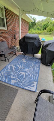 [This review was collected as part of a promotion.] The blue World Rug Gallery Contemporary Palm Leaf Rug looks great on my patio by my pool. It is easy to keep clean and durable in the weather. I usually just sweep it off but it isn't very heavy, so when I need to, I pick it up and shake it out. This rug could be used indoors as well.