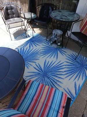 [This review was collected as part of a promotion.] beautiful, durable feeling small outside rug for a small patio space. really brightened up my backyard with the beautiful blue color. feels easy to clean.