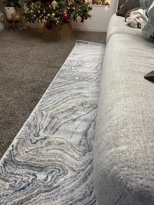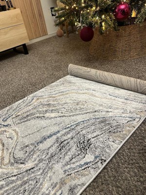 [This review was collected as part of a promotion.] My new rug has a clean, minimalist vibe, like a flowing lake. Its gray tones mixed with beige and touches of blue make it very versatile, ideal for any space—modern and cozy without being too flashy. The texture is soft yet durable, just the right balance for a high-traffic area like next to the sofa. The marbled pattern adds a lot of presence. Plus, the fact that it's 70% polypropylene makes it easy to clean, perfect for a home where you want things to look beautiful without worrying about stains. It's a rug that feels modern and goes with everything. It blends beautifully with my Christmas tree. I feel like this type of piece doesn't steal the show, but it does elevate my space.