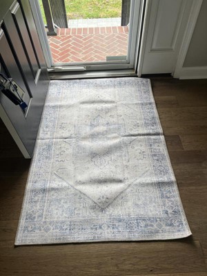 [This review was collected as part of a promotion.] I received this World Rug Gallery Medallion Boho Machine Washable 2'1"x3' Blue Area Rug from TryIt in exchange for my review. It's a VERY pale design, so the rug looks old already but it's still pretty. It doesn't slip when walked on, has a thin mat on the underside. It's also washable which is a huge plus!