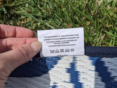 - Reversible crease-free waterproof premium recycled plastic outdoor rugs. Easy Care: These stain resistant rugs are easy to maintain. When spills and accidents occur, blot the stains, rinse with a hose, sweep or use a leaf blower to remove dirt.Rug pad recommended for indoor uses only.