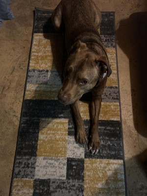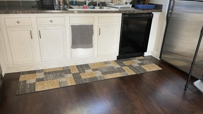 [This review was collected as part of a promotion.] So very happy with this rug. The design and varying gray colors compliment the decor in the kitchen while the size is large enough to be seen and yet small enough to not overload the space. Material is soft to the touch, durable to withstand the day to day trampling, and easy to maintain. A month of being in this home with multiple dogs, kids, and many visitors (plus a few spills); this rug is holding strong and looking good!