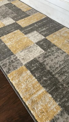[This review was collected as part of a promotion.] This wrong is absolutely beautiful! It is perfect for my bedroom. It is geometric boxes with the colors white, grey and yellow. It isn't super thick but it is so soft and comfortable to sit and walk on. It doesn't collect much dirt but it is super easy to vacuum and clean. I am in love with my new rug.