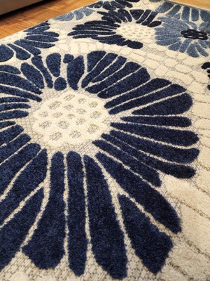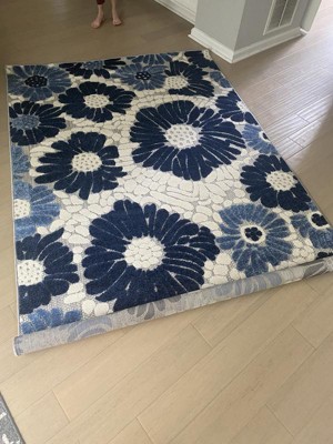 [This review was collected as part of a promotion.] The Nottingham modern floral flower rug it looks very nice on my deck with the nice blue colors my table looks so nice sitting on the rug the best part about the rug it is indoor outdoor