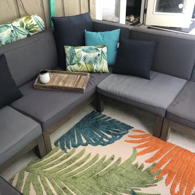 [This review was collected as part of a promotion.] I'm loving the texture in this rug the bases a flatter surface and the raised leaves look really nice very soft to the touch and very nice colors will brighten up any porch and add a touch of fun. Really nice quality looks like it will last quite some time and I like the idea that I can power wash and let dry in the Sun. I have never seen a rug like this before with two different textures I really love it. I can't wait for warmer weather to have a nice little get together and show it off