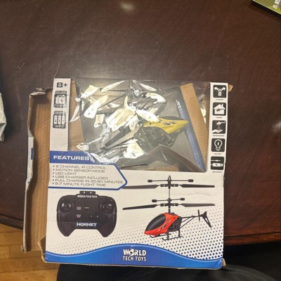 Try out helicopter flying fun with the World Tech Toys Hornet 2CH RTF IR RC Helicopter! 2 Channel control simplifies the controls and with the transmitters auto back controls you can master the throttle control before moving up to larger helicopters. Charging the Hornet is easy, just plug the helicopter onto the transmitter with 4AA batteries and once its charged your good to go. Flying indoors is simply fun with the Hornet 2CH RTF IR RC Helicopter. Get yours today!