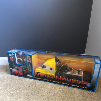 Can't decide whether you want a RC truck or RC helicopter? Get both with the MEGA HAULER 3.5CH Helicopter And Truck IR Combo Pack! This amazing package includes a RC semi truck that holds a RC helicopter. Both are controlled by a single IR transmitter. With a flip of the switch you can switch from driving to flying or vice versa! The RC semi truck features full function IR control, LED cabin lights, rubber tires and a helipad on the transport trailer. The RC helicopter features 3.5 channel IR control, a gyroscope, LED lights, a coaxial rotor, a built in rechargeable internal battery and two speed modes. These bad boys are and (Ready to Run and Ready to Fly). So get racing and flying with the MEGA HAULER 3.5CH Helicopter And Truck IR Combo Pack!