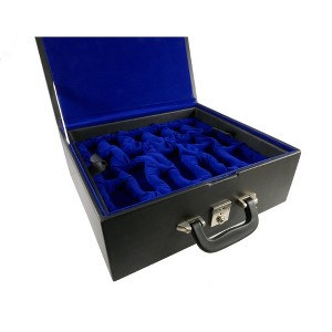 Black Vinyl Box Two Trays w/slots for men up to 4.5" King and 2.25" base. Lined with blue felt to protect chess pieces.