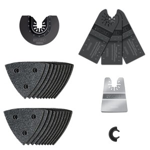 With this 26 piece oscillating accessory kit you’ve got everything you need to saw, cut, scrape, sand and more on a variety of different materials. And the Universal Fit System means you can use these accessories with all popular brands of oscillating tools. Includes (3) - Wood Cutting End Cut Blades ,(1) - HSS Semicircle Saw Blade,(1) - Rigid Scraper,(20) - Sanding Sheets, (1) - Adapter for Cordless Dremel and Bosch Tools