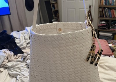 I am not normally a fan of Target purses because the tend to look cheap, but after eyeing this one multiple times I bought it and so glad I did! It’s a great bag that isn’t super large but still holds a decent amount, the woven material is really pretty, and the thick strap stays on my shoulder well (I hate when straps slide off). I adjusted it by one hole and it still looks fine. Overall great bag for summer, I might get the white too!