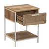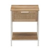 - This 2-tier boho-inspired end table showcases a subtly rustic rectangular tabletop in a coastal oak finish and a single drawer with unique mock rattan detailing set in a sleek, white metal frame