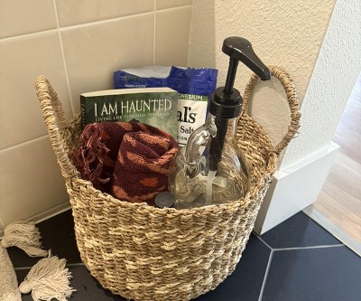 I love this basket & its versatility. It’s beautiful woven design can be used to help elevate my Fall decor (Target pumpkins inside) or for any household needs. I’ve got a couple!