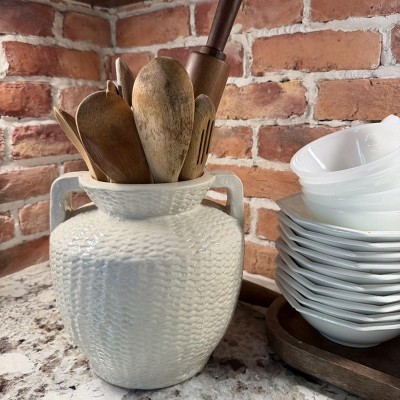 Whether you're accenting a bookshelf or creating a centerpiece, this Large Woven Texture Ceramic Vase from Threshold™ designed with Studio McGee beautifully blends farmhouse flair with timeless elegance. This decorative vase features a classic urn-shaped body with a distinct, raised basket-weave exterior and integrated side handles for an artisanal piece you can display on its own. Crafted from ceramic with a watertight construction, it's also perfect for displaying fresh or faux florals on your console, dining table or mantel.