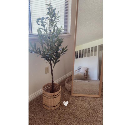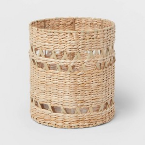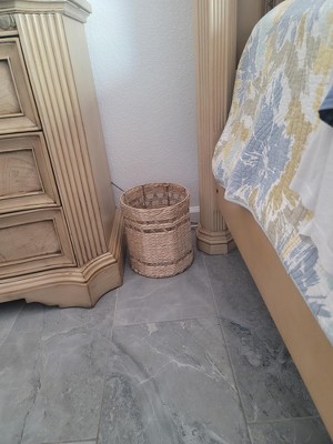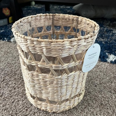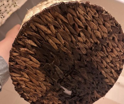A: The waste can is made from cattail leaf, giving it a natural look.