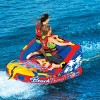 Lean on back and enjoy the ride with the two-person Beach Bubba. The extra high backrest and sidewalls make everyone feel secure and comfy on the water during extra fast, bouncy rides. Ride your way: standing chariot style, kneeling chariot, or even laying down! The double webbing foam handles will help you hold on tight no matter what you choose. The Beach Bubba has a smooth, comfortable surface all over, for a comfortable ride. We also enhanced it with some HI-VIS graphics that won't rub or chip off, so it stays looking stellar summer after summer. Includes a one-year warranty.