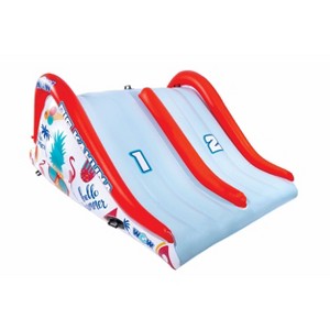 At 9 x 7 x 4 feet in size, this two-lane waterslide earns its name, THE BIG KAHUNA. Put it next to the pool or on the dock for an unforgettable time. Its secure inflatable siderails and middle divider allow two pals to slide down at the same time. It has built-in sprinklers for an even slicker PVC sliding surface, too — just connect it to any standard garden hose. The heavy-duty molded handles are easy to hold while you rush to the top. Great poolside or on the dock. Maximum capacity 400 lbs. Includes a one-year warranty.