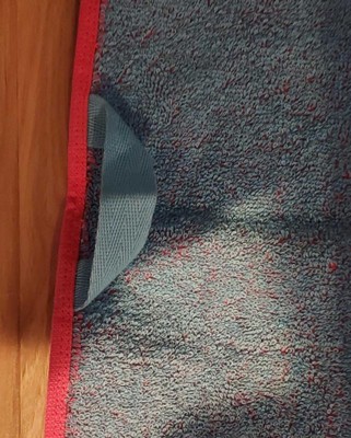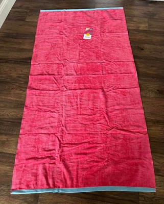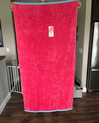 [This review was collected as part of a promotion.] This is the Sun Squad wow reversible beach towel in red. So the color says red online, but this towel is pink. It is a pretty dark pink, but definitely not red. I like the light blue piping on the side of the towel. This towel is soft with a medium weight. I don’t really understand the reversible aspect. The back is blue, but definitely not as soft and smooth as the pink side. I received an incentive to write this review.