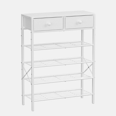 WOWLIVE 5-Tier Shoe Rack Black Metal with Rustic Brown Wood Top Shelf and 2 Non-woven Drawers