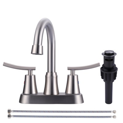 Product Name: WOWOW 4 in. Centerset Double-Handle Gooseneck Bathroom Faucet with Pop-Up Drain in Brushed Nickel