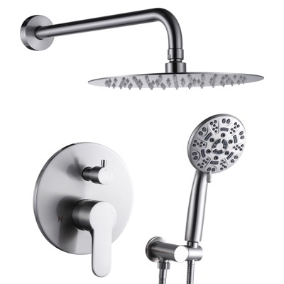 Enhance your bathroom with the rainfall shower set, including a 10 in. fixed showerhead and a 4 in. handheld shower for versatile use. The wall-mount installation positions the showerhead overhead. It feels like creating the sensation of rainfall cascading down for a luxurious shower experience.