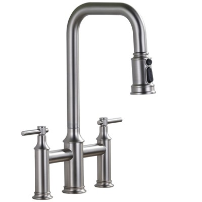 Product Name: WOWOW Double Handle Bridge Kitchen Faucet with Pull-Down Sprayer in Brushed Nickel