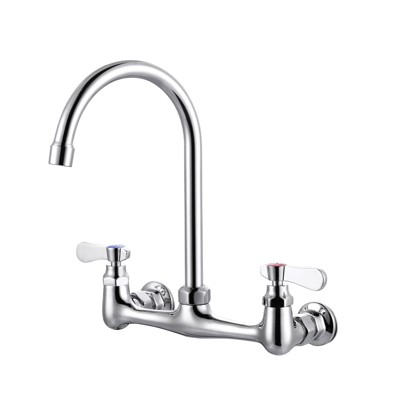 The Commercial Sink Faucet Kitchen features an adjustable wall mount, 8 in. adjustable center distance, and an eccentric flange design that allows for flexible center distance adjustments from 7.75 - 8.25 in. depending on space requirements. Made of solid brass for durability and resistance to high-intensity commercial environments. The surface is polished chrome, easy to clean, corrosion-resistant, and stylish to match all types of decorations. 18 inches long 360° swivel double-jointed rocker arm, easy to clean without dead ends. Two handles for precise temperature control, 2.2 GPM high flow rate with aerator, stable and quiet water flow. It is the right choice for restaurants, hotels, school cafeterias and other places with large water consumption