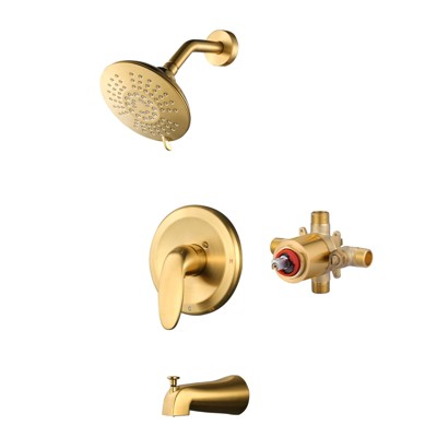 The sleek and modern design of this shower faucet makes it an ideal choice for contemporary bathrooms, enhancing the overall aesthetic appeal of the space. Crafted from high quality materials, the solid brass body and stainless-steel shower arm ensure exceptional durability and corrosion resistance, guaranteeing years of reliable performance. The single handle operation makes it easy to control the water flow and temperature, providing you with a convenient experience. 6-inch diameter shower head features 5 spray settings, offering a variety of options ranging from a gentle, rain-like flow to a powerful massage spray, catering to your diverse showering preferences. The included tub spout with a convenient diverter allows for effortless switching between filling your tub and enjoying a shower. Upgrade your bathroom with our Single Handle 5-Spray Shower Faucet with Tub Spout.