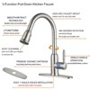 Simple and elegant design for any kitchen style. This pull-down kitchen faucet features a 360° swivel spout that provides a wider water area and greater flexibility. The spray head with three functions can switch between aerated stream, powerful spray, and sweep to meet all your kitchen needs. Purchase this product, and you will enjoy using it in your kitchen.