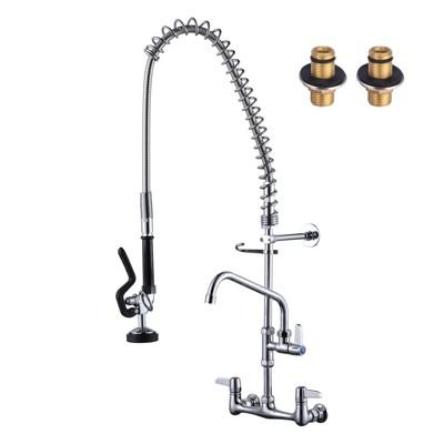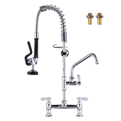 Engineered for durability and functionality, this brass commercial deck-mounted kitchen faucet is designed to meet the rigorous demands of foodservice environments. Constructed from solid brass, it resists corrosion, stains, and heat damage, maintaining a pristine appearance even in high-traffic kitchens. An innovative pull-down sprayer design offers unparalleled flexibility, reaching every corner of your sink with ease. Triple handles provide precise control over temperature and flow rates, while the dedicated pre-rinse spray head tackles diverse tasks, from rinsing delicate dishes to scrubbing heavy cookware. A spring-loaded hose retracts automatically after use, maintaining workspace order. Deck-mounted installation is straightforward and suitable for most kitchen sink configurations.