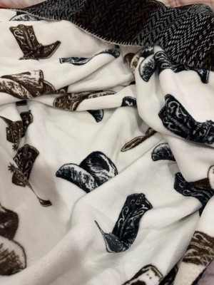 - Classic Wrangler blue, brown, and white printed reversible blanket with a steer skull brown print on a white ground