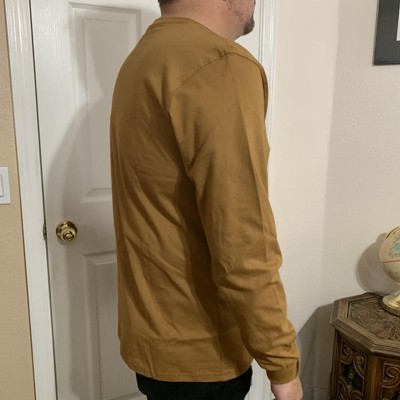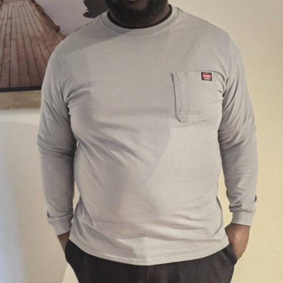 [This review was collected as part of a promotion.] This men’s size medium t-shirt fits true to size. It has long sleeves and a crew neck. There is a single pocket on the chest that has a logo patch stitched on it. The t-shirt is made from a firm heavyweight cotton material. It is a solid light grey color. This shirt could be good for work, relaxing, or wearing out casually. This shirt is a nice quality for a great price. I received an incentive to write this review.