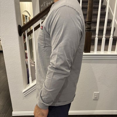 [This review was collected as part of a promotion.] This men’s size medium t-shirt fits true to size. It has long sleeves and a crew neck. There is a single pocket on the chest that has a logo patch stitched on it. The t-shirt is made from a firm heavyweight cotton material. It is a solid light grey color. This shirt could be good for work, relaxing, or wearing out casually. This shirt is a nice quality for a great price. I received an incentive to write this review.